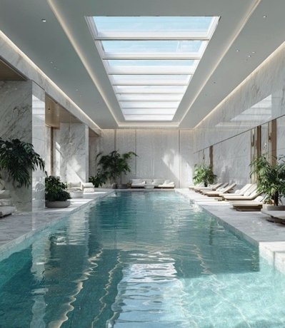 На территории расположены крытые и открытые круглогодичные бассейны